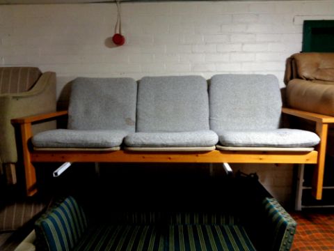 A 20th century pine framed continental three seater settee with grey fabric cushions
