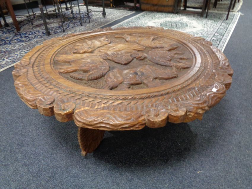 A heavily carved shaped African coffee table depicting animals on elephant supports