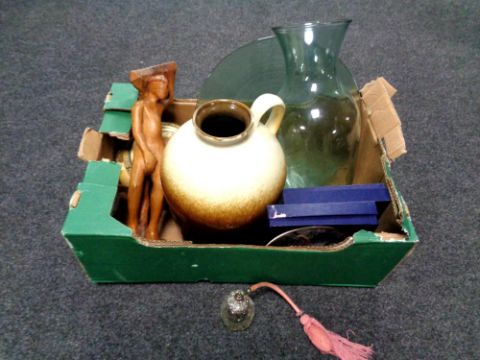 A box containing miscellaneous to include West German vase, a carved wooden figure, glass bowl and vase, silver and cut glass perfume bottle