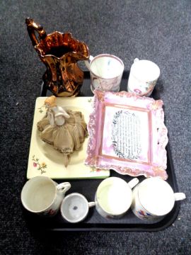 A tray of antique china to include copper lustre jug, lustre shallow dish, Great War tankards etc