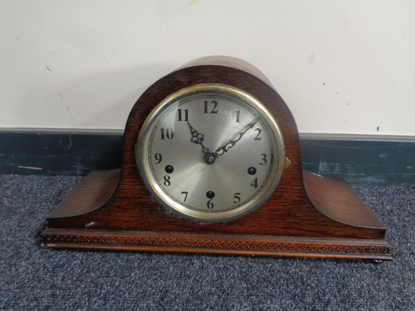 An oak cased 1930s Enfield mantel clock with silvered dial