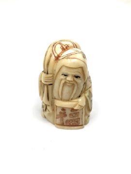 A carved bone Chinese netsuke - Gentleman holding sack