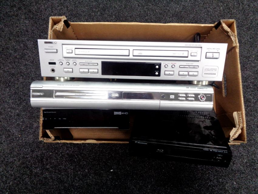 A box of Welltech CD twin deck recorder, Phillips DVD recorder, Freeview box, Maidstone blu ray player