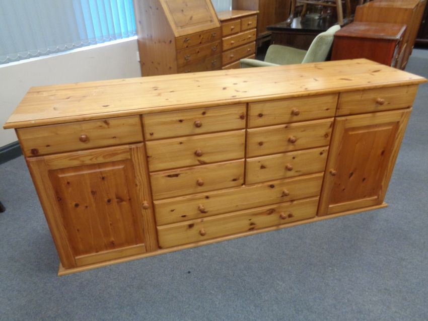 A contemporary pine sideboard fitted two cupboards and ten drawers