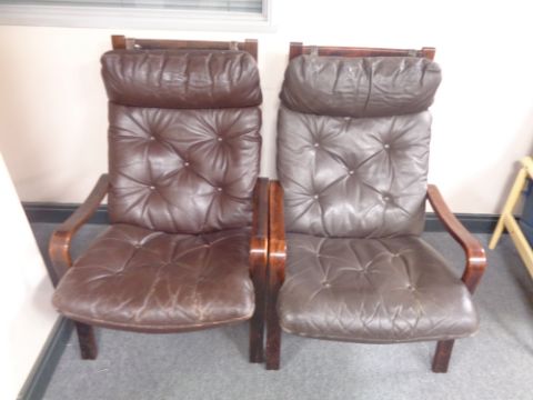 A pair of 20th century stained beech high back armchairs with brown buttoned leather cushions