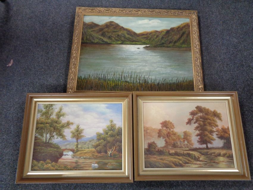 An M. Southern oil on board, figure in a rowing boat on a lake, framed, together with two P. Wilson gilt framed canvases