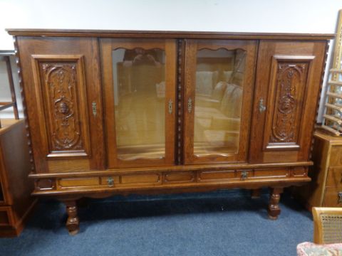 A continental style oak four door sideboard with two carved panel doors, fitted drawers beneath on raised legs