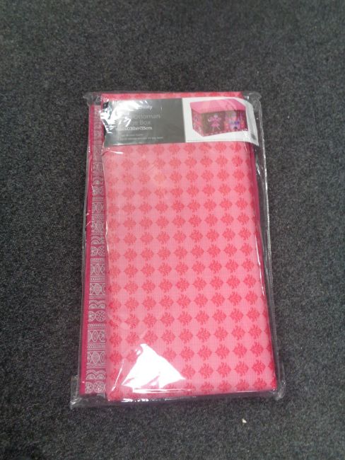A box containing new vintage linen and towels together with a child's Ottoman storage box