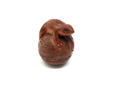 A carved hardwood Chinese netsuke - Frog on a fruit