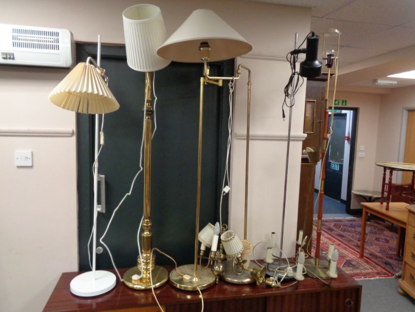 A collection of six continental floor and standard lamps together with two further brass light fittings