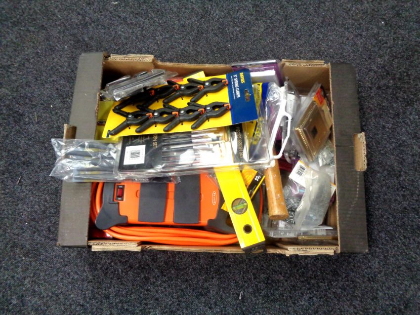 A box of extension leads, brushes, socket covers, spring clamps etc