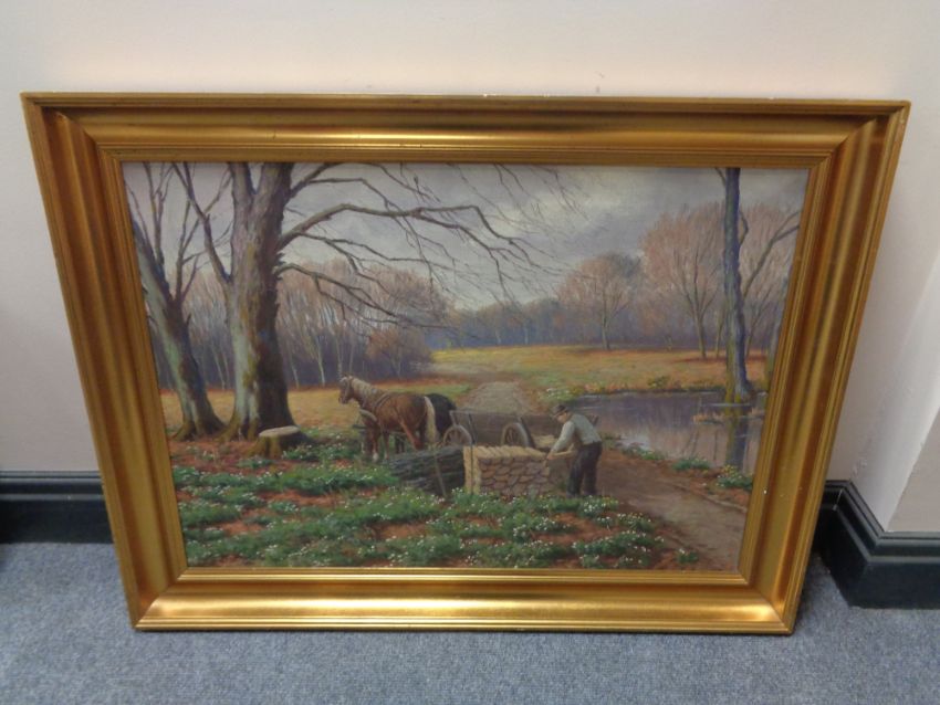 A continental school oil on canvas, man loading wood on to a cart, in gilt frame