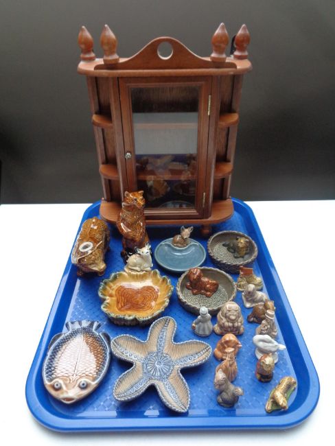 A tray containing Wade whimsies and dishes, a miniature Curio cabinet, a Beneagles Scotch Whisky decanter, 50ml sealed.