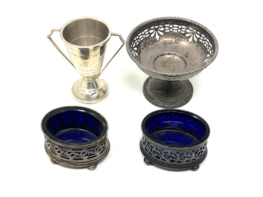 Two silver salts, a loaded silver pedestal bowl and a small silver trophy (4)