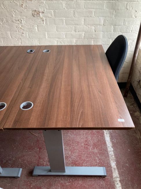 A Dark oak effect desk, width 140 cm, together with a black swivel chair. (2)