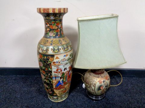 A Japanese style vase depicting Geisha, height 60cm, and a similar table lamp with shade