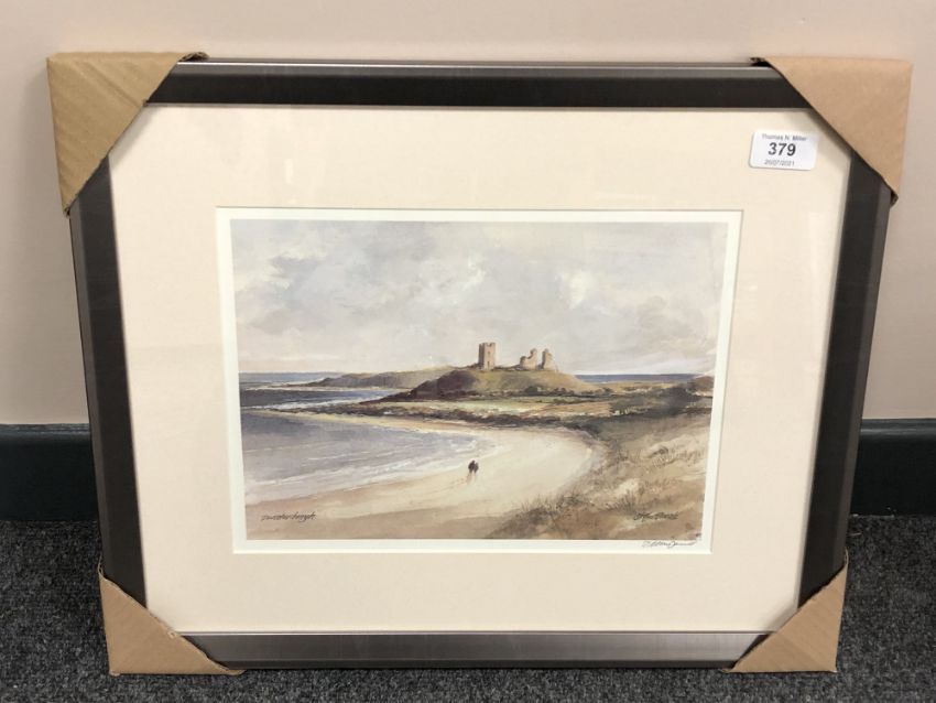 After Tom MacDonald : Dunstanburgh, reproduction in colours, signed in pencil, 21 cm by 30 cm, framed.