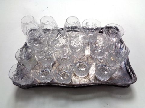 A silver plated gallery tray on claw and ball feet containing assorted lead crystal whisky and brandy glasses to include Webb crystal