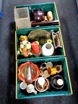 Three plastic crates of vases, West German vase, beer steins, glass candlesticks etc