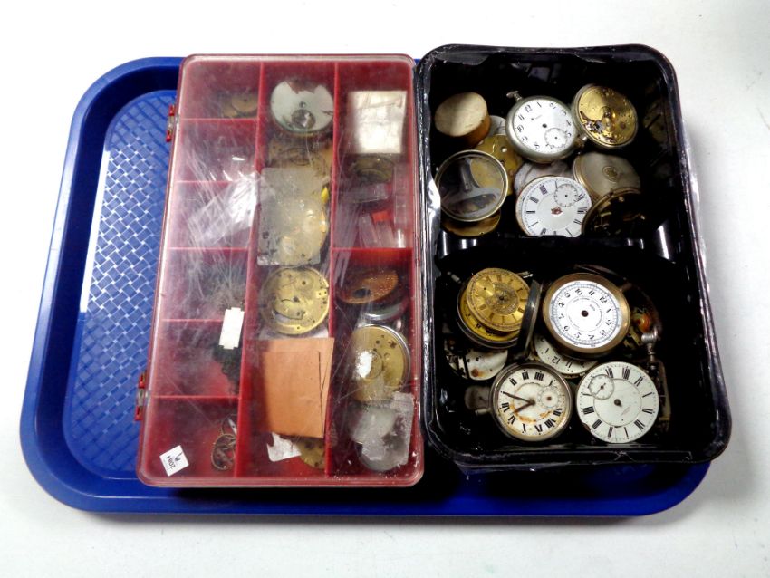 A tray containing horologist's pocket watch parts
