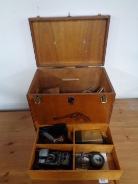 A 20th century Sako plywood box containing battery charger, Precision Gold Academy PG 10B tester, soldering iron stand etc