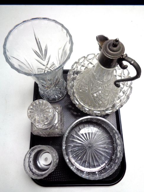 A tray containing assorted glassware to include silver plated and cut glass claret jug, lead crystal and cut glass fruit bowls, vases, whisky decanter