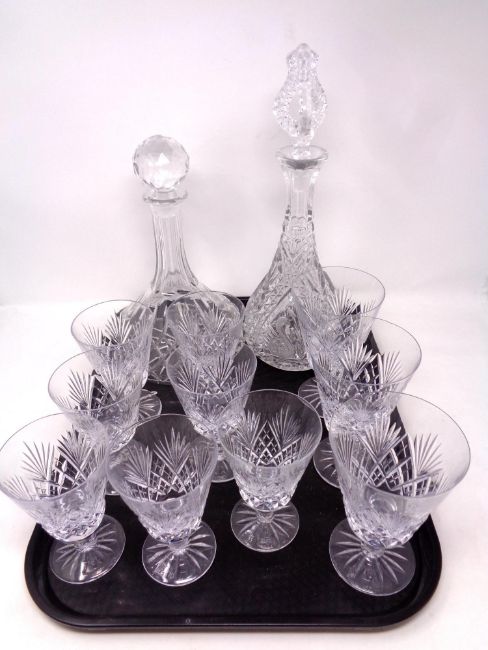 A tray containing assorted Webb crystal wine glasses together with a lead crystal ship's decanter and a cut glass liqueur decanter