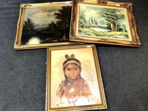 * Stone : Portrait of a young Native American, oil on panel, signed, 50 cm x 39 cm, together with two further framed oil paintings depicting lake scenes, all three parts framed. (3)