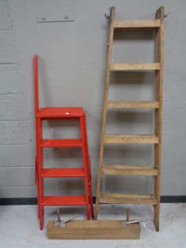 Two sets of folding wooden steps together with a wooden vice