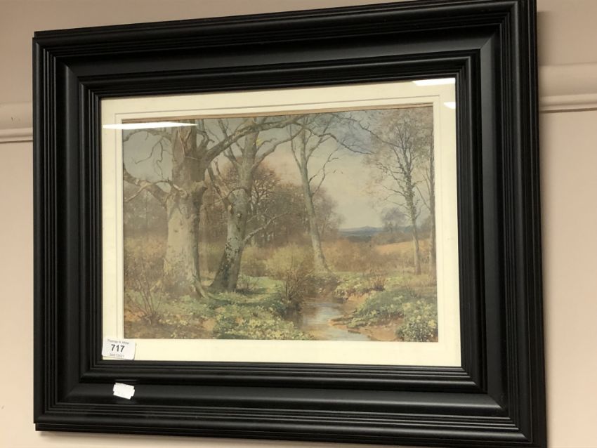 A 20th century colour print depicting trees by a stream, 34 cm x 24 cm