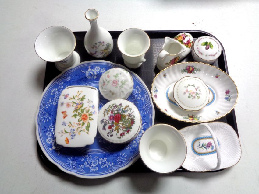 A tray of cabinet china - Spode dish and basket, lidded trinket boxes, Coalport vases, Spode plates etc