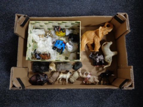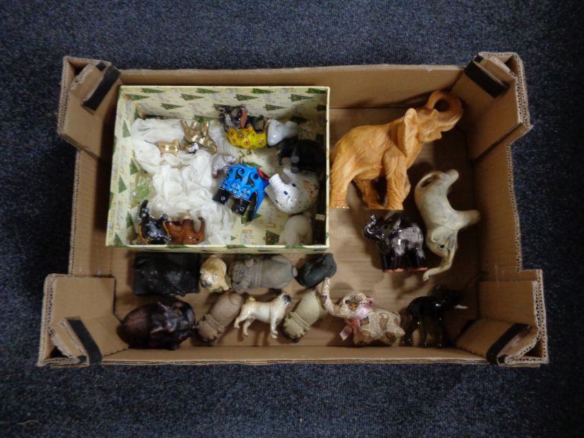 A box of a quantity of elephant and pug ornaments to include glass and ceramic examples, together with a Beswick figure of a pug