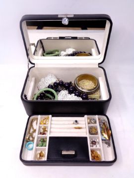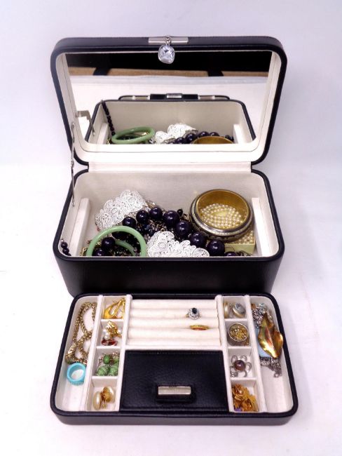 A leather jewellery box containing a quantity of costume jewellery to include brooches, earrings, necklaces