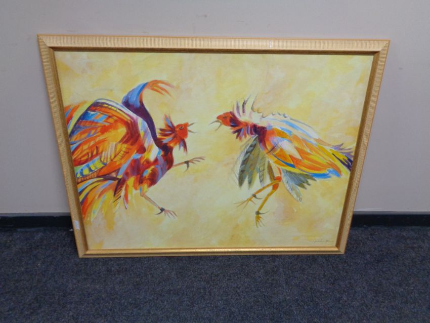A contemporary oil on canvas, fighting cockerels, indistinctly signed