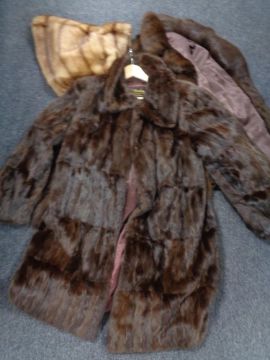 A box of lady's fur coat, fur wrap and a simulated fur coat