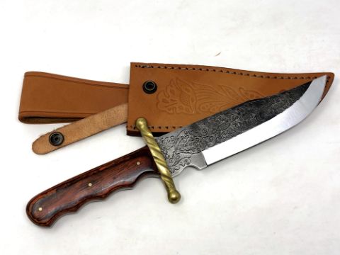 A Bowie knife with engraved blade and brass cross guard, in leather sheath