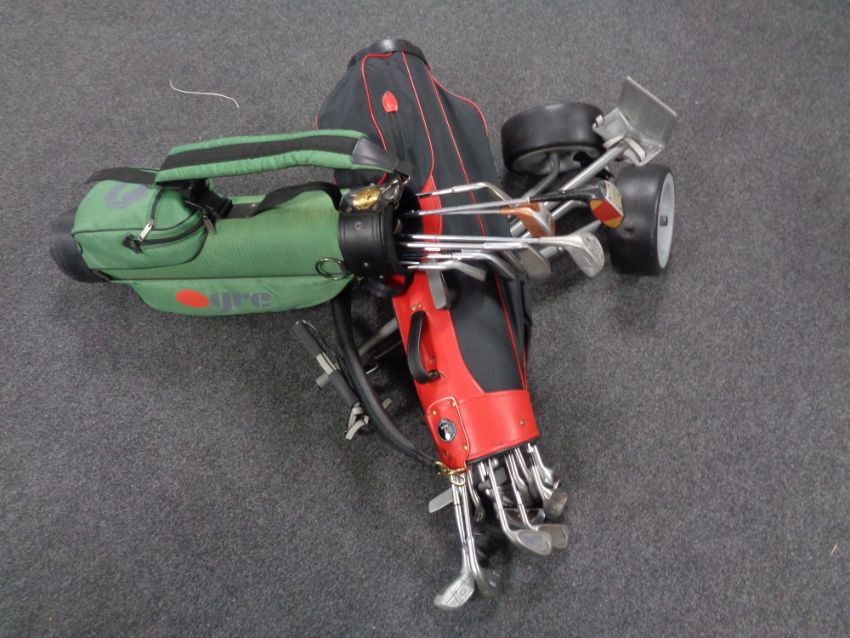 Two golf bags containing assorted irons, drivers and putters together with a folding golf trolley