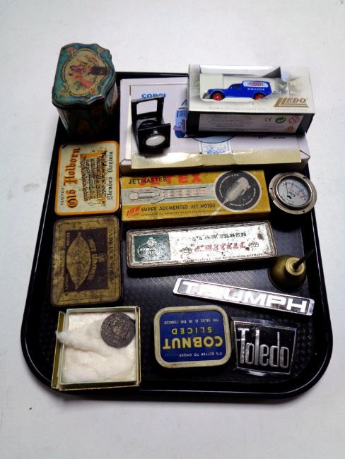 A tray of collectables - boxed die cast vehicles, car badges, vintage tobacco tins, Newcastle upon Tyne Edward VII coronation medal