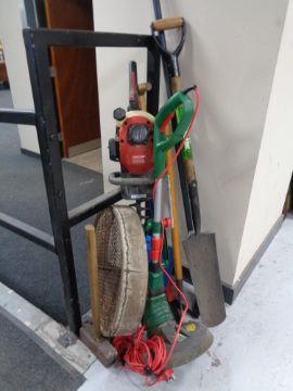 An electric strimmer together with a petrol hedge trimmer, a wooden sieve and a small quantity of garden tools