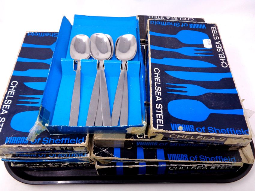 A tray of a quantity of boxed Viner's stainless steel and Chelsea steel table cutlery