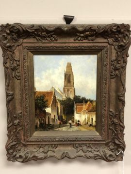 Attributed to John Hall : figures in a street, oil on panel, 19 cm x 24 cm, framed