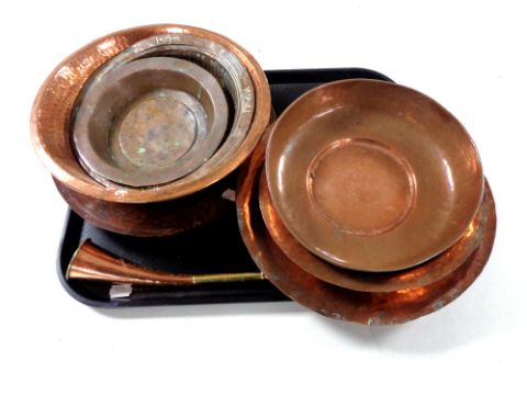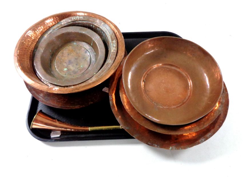 A tray of antique copper wares : eight dishes and plates, copper and brass horn