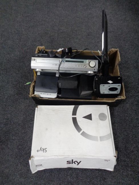 A box containing assorted electricals to include Sony DVD player, Panasonic blu ray player, 18inch LCD TV Sky Box etc