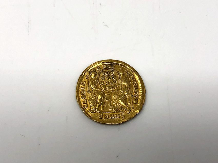 A Byzantine Empire gold solidus of Constantine II, mint of Antioch, obverse FL IVL CONSTANTIVS PERP AVG, helmeted bust facing, holding spear and shield, reverse GLORIA REIPVBLICAE, Roma and Constantinopolis seated, holding shield inscribed VOT XXX MVLT XXXX, 4.4g