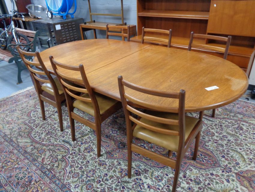 An eight piece 20th century teak G-Plan dining room suite comprising display unit fitted cupboards and drawers beneath, oval extending table and six chairs