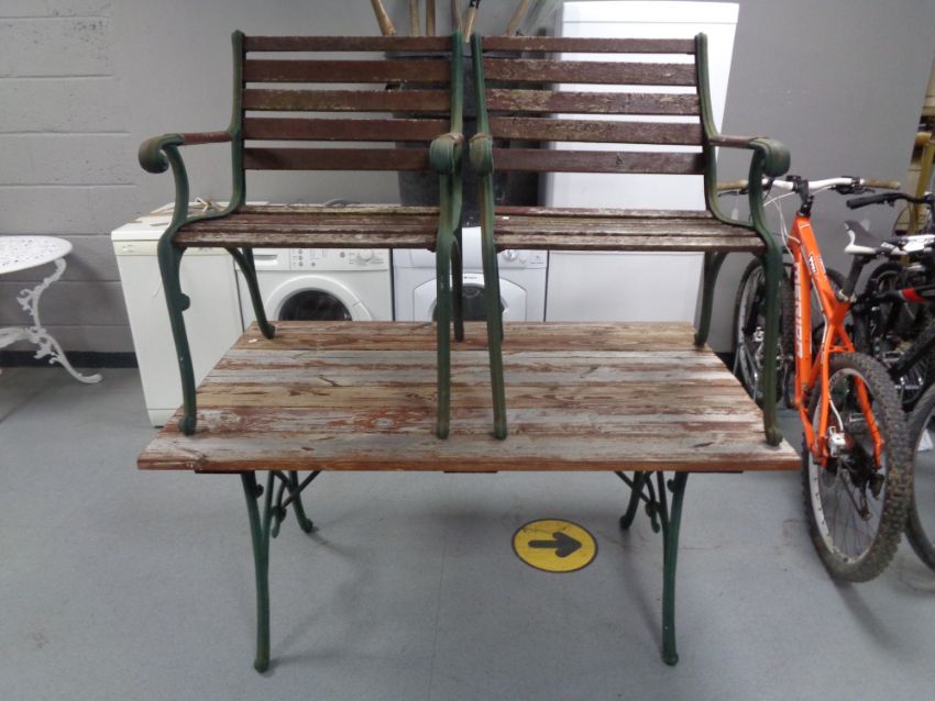A cast iron wooden slatted garden bench with matching pair of armchairs