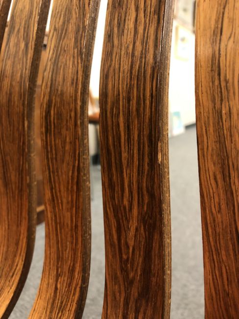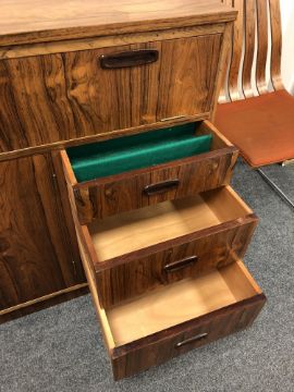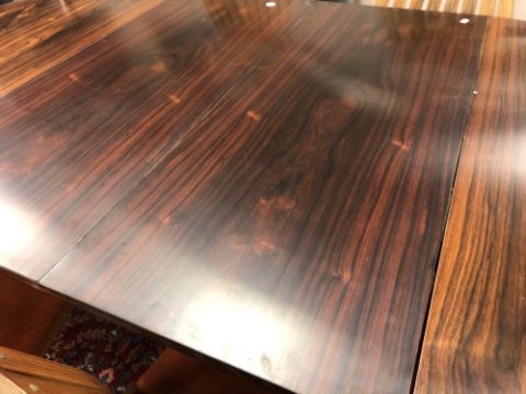 The suite appears to be in very good condition overall. The two cabinets and the table have some typical fine surface scratches to the finish. The glazed cabinet has a small chip to the veneer at the back on the lower left. The key is present for the fall front. The table leaves are darker in colour than the two main sections. The table has some shallow surface scratches and some streaks of white paint in a few areas which would rub off easily. Two of the chairs each have a small section of damage to one of the uprights of the back rests, see close-up images. All of the chairs have somewhat wobbly legs.