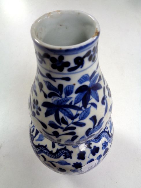 A Chinese porcelain blue and white double gourd-shaped vase depicting flowers and dragons, height 26.5 cm, character marks to base
