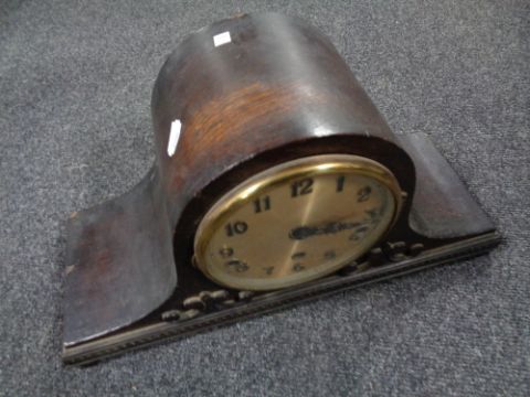 A 1930s oak cased mantel clock with silver dial.