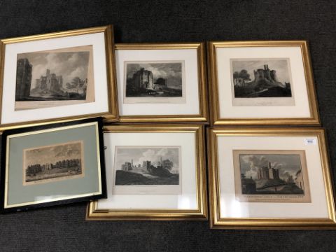 Alexander Hogg (Publisher) : Warkworth Castle, in Northumberland, steel engraving by Grainger, with hand colouring, 13 cm x 18 cm, together with four further steel engravings all depicting Warkworth Castle and one depicting Heaton Hall, all parts framed. (6)